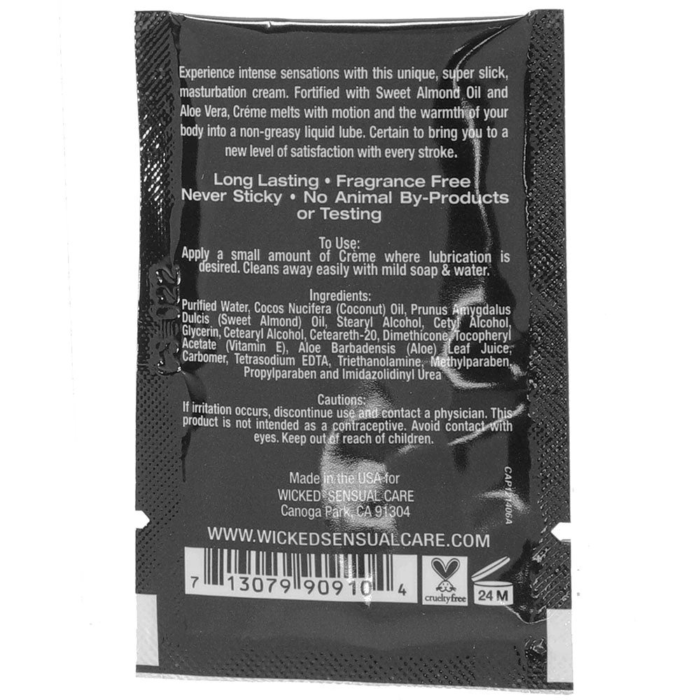 Dense and pillowy straight from the packet, Creme melts quickly with friction into a super-smooth liquid lube. The oil based formula won’t dry up or wear away, so there’s no need to interrupt pleasure to reapply. Afterward, use a little warm soapy water to clean any leftover Creme from body or fabrics.